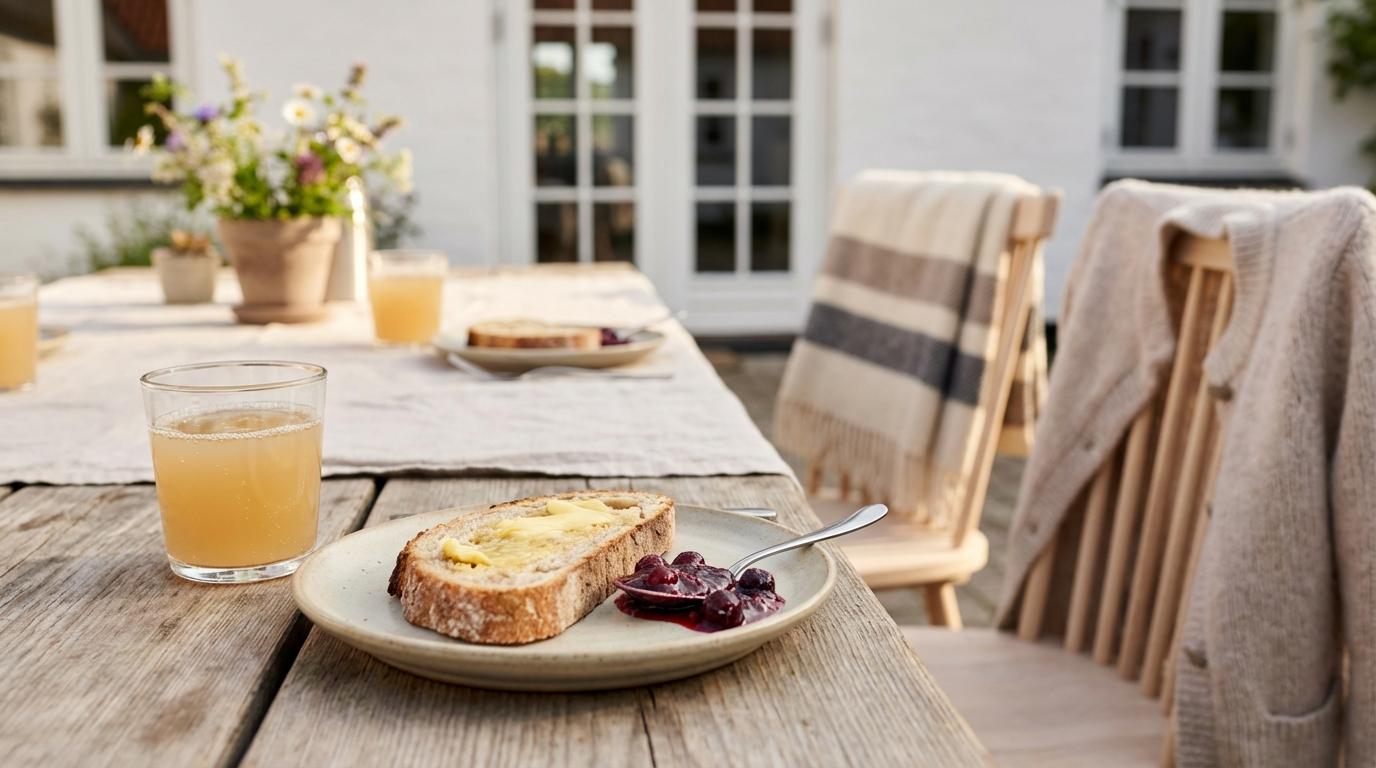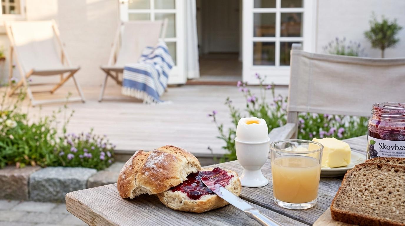 Økologisk morgenmad gårdophold: nyd hjemmebag, æg, yoghurt og juice i roligt fællesrum/gårdhave – smag sæsonen på landet med omtanke og nærvær.