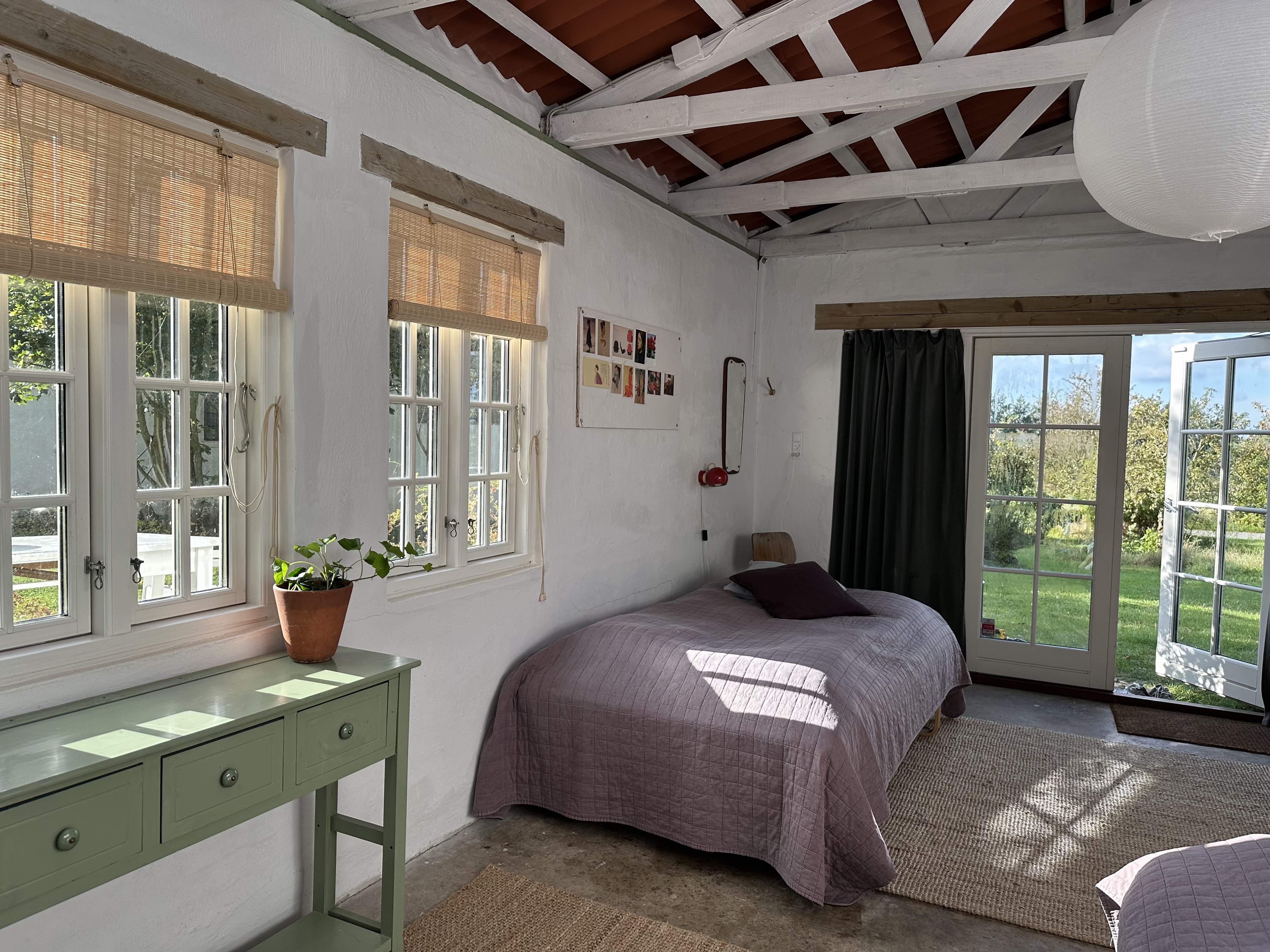 Her er kunstbøger, farver og papir og et stort abstrakt maleri på endevæggen. Her er plads til fordybelse, hvis du ønsker at lave kunst, eller skrive en bog. Her er også plads til hygge og leg hvis I er en børnefamilie.
