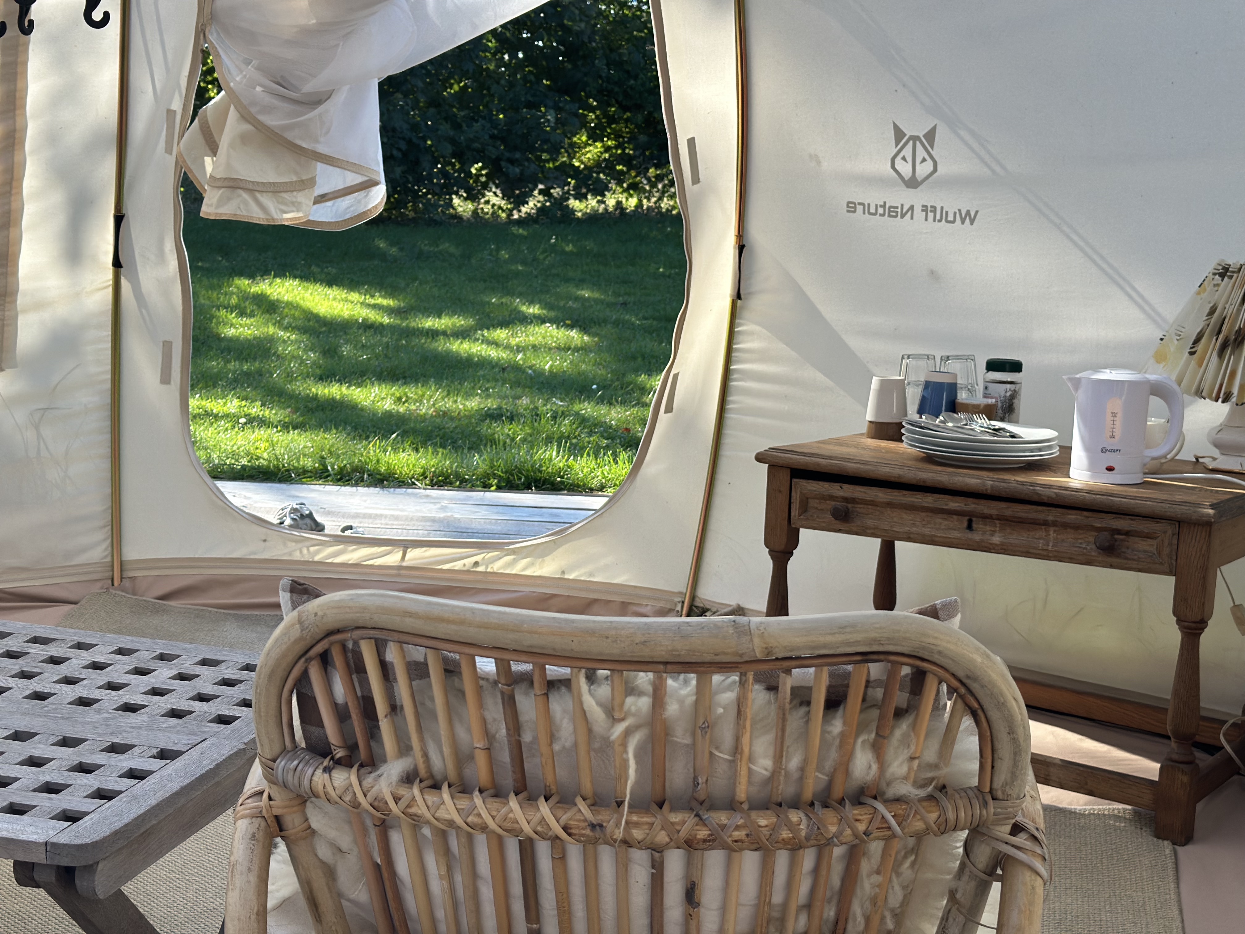 There is crockery and cutlery, an electric kettle, table and chairs inside and outside the tent.